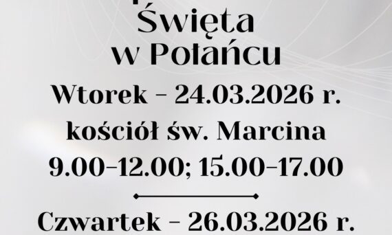 We wtorek spowiedź w parafii św. Marcina w godzinach od 9.00 do 12.00 (przerwa od 10.30 do 11.00) i od 15.00 do 17.00, a w czwartek, odbędzie się spowiedź w naszej parafii w godz. od 9.00 do 12.00 (przerwa od 10.30 do 11.00) i od godz. 15.00 do 17.00.