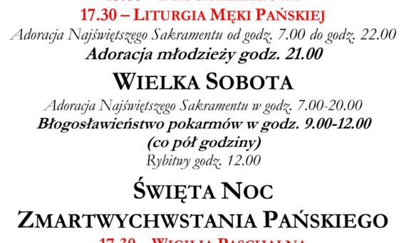 Wielki Czwartek 17.30 – Msza Święta Wieczerzy Pańskiej Adoracja Najświętszego Sakramentu do godz. 22.00 Wielki Piątek 15.00 – Droga Krzyżowa 17.30 – Liturgia Męki Pańskiej Adoracja Najświętszego Sakramentu od godz. 7.00 do godz. 22.00 Adoracja młodzieży godz. 21.00 Wielka Sobota Adoracja Najświętszego Sakramentu w godz. 7.00-20.00 Błogosławieństwo pokarmów w godz. 9.00-12.00 (co pół godziny) Rybitwy godz. 12.00 Święta Noc Zmartwychwstania Pańskiego 17.30 – Wigilia Paschalna