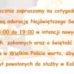 Jutro w sobotę 17 lutego Parafialny Dzień Modlitw o Powołania Kapłańskie. O godz. 15:00 wystawienie Najświętszego Sakramentu i Koronka do Bożego Miłosierdzia. Następnie osobista modlitwa w ciszy przez Panem do godziny 17:00.