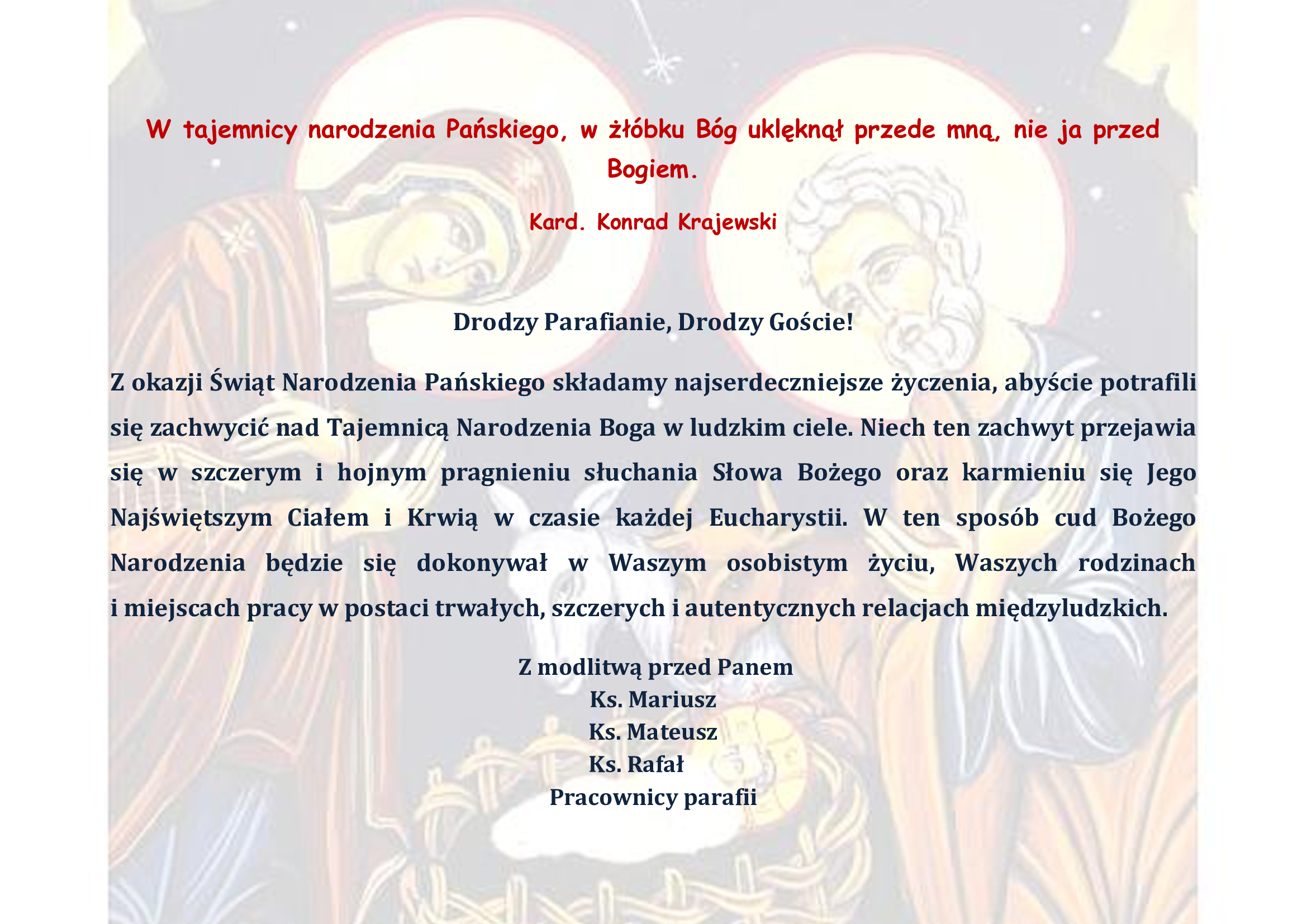 W dniu dzisiejszym ( czwartek) w naszej parafialnej świątyni zapanował świąteczny klimat. Dzięki życzliwości Parafian, wspólnymi siłami przygotowaliśmy nasz kościół na Uroczystość Narodzenia Pańskiego. Wczoraj w czasie spowiedzi parafialnej zadbaliśmy o czystość świątyni własnego serca, dziś zatroszczyliśmy się o tę świątynię widzialną 🙂 A więc właściwa kolejność została zachowana 🙂 Wszystkim dziękujemy za pomoc i zaangażowanie.